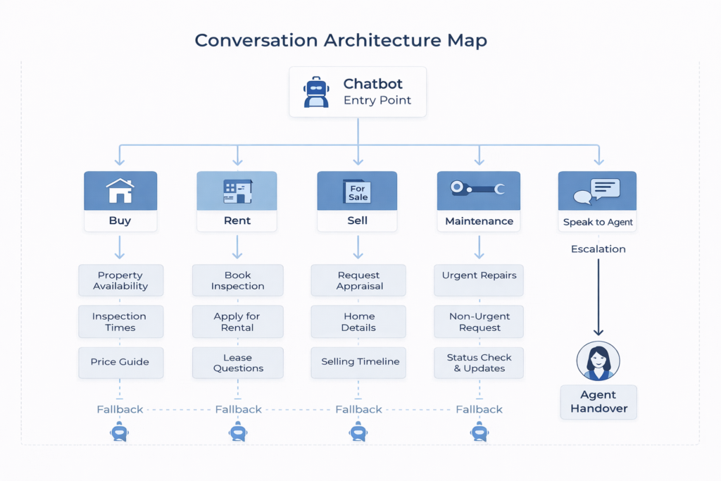 Detailed conversation flows were then created for key scenarios, including buyer enquiries, inspection bookings, seller appraisal requests, rental application support, and maintenance requests. Each flow was designed using progressive disclosure, asking only the minimum information required at each step and adapting responses based on user input. This helped reduce cognitive load and mirrored natural human conversation patterns.