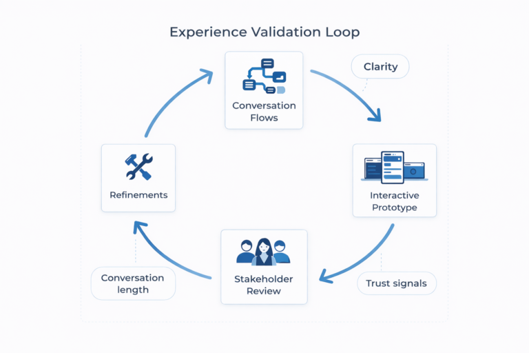 Prototypes were shared with cross-functional stakeholders, including product, engineering, and operational teams, to align on feasibility and technical constraints. Feedback from these sessions informed refinements to both the conversation logic and UI patterns before moving into formal testing.