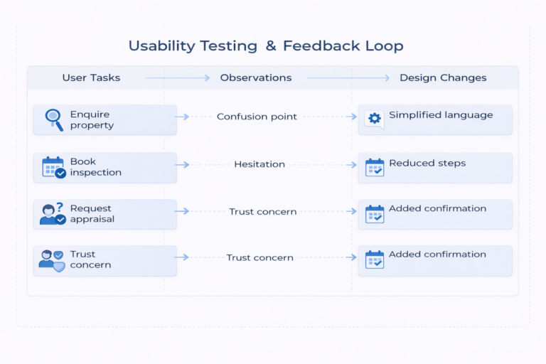 Usability testing was conducted to evaluate how real users interacted with the chatbot and to identify areas of friction or confusion. Moderated usability sessions were run with participants representing buyers, sellers, renters, and existing tenants.